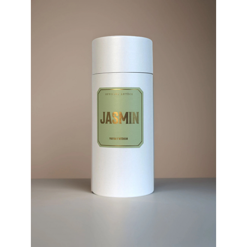 Notre parfum d’intérieur "Jasmin" est présenté dans un élégant flacon blanc mat et dans une boîte cylindrique.